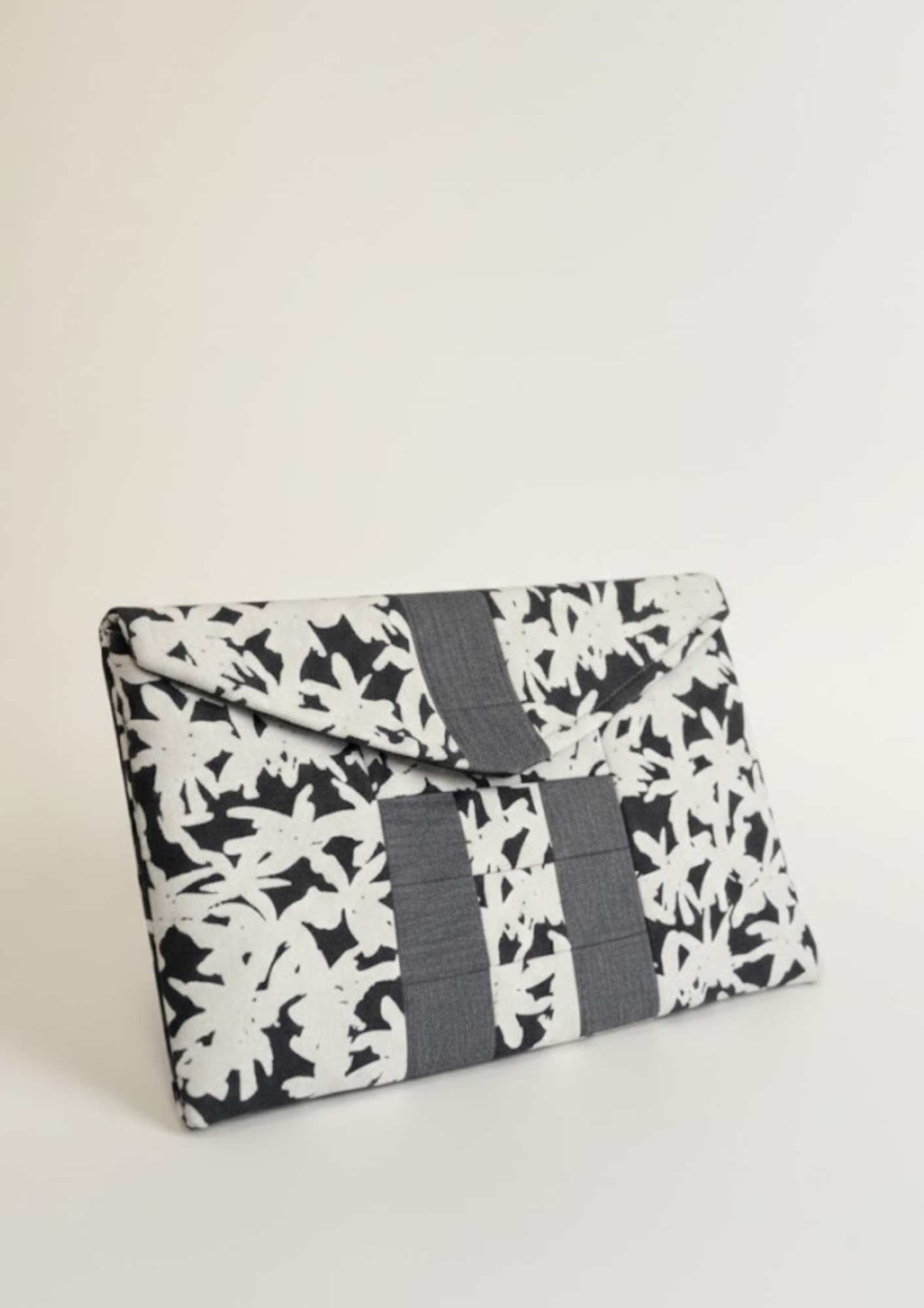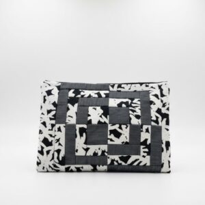 Elle est composée de blocs de tissus variés, incluant du jean denim et un motif palmier blanc sur fond noir. L’ensemble crée un contraste graphique et moderne.