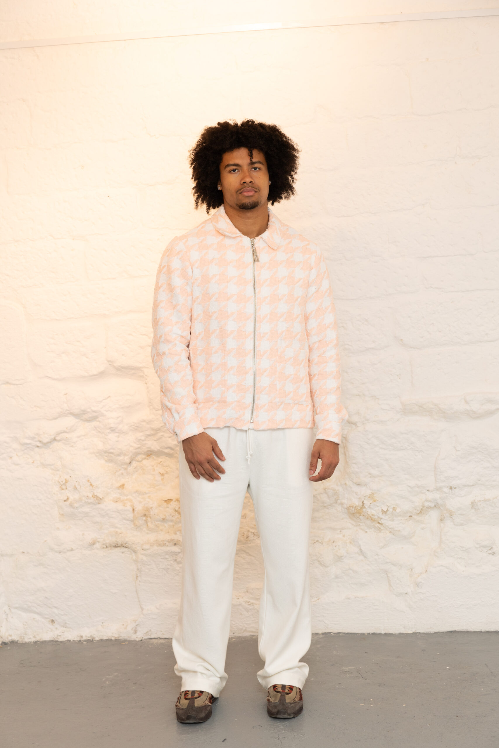 Motif pied-de-poule classique revisité dans une teinte douce et moderne